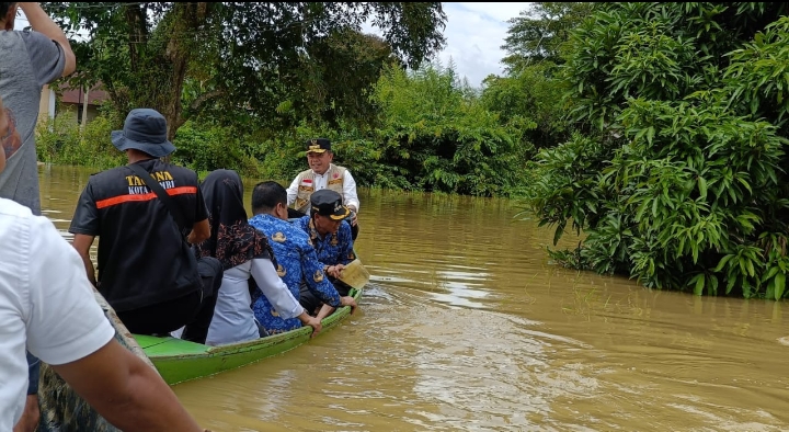 Dengan menggunakan perahu Gubernur Al Haris meninjau kondisi warga dan memberikan bantuan langsung ke rumah warga yang terdampak banjir. Adapun bantuan yang diberikan Gubernur berupa bahan pokok.